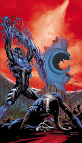 The Reach has basically already won as this issue opens. Kyle Rayner sees that Odym is already halfway cocooned and tries to reason with Saint Walker to not sacrifice his Blue Lanterns to a lost cause. Of course, the Blue Lanterns of Hope don't really understand the meaning of "lost cause", and they show it by uniting their rings into a single wave that they use to free the Reach soldiers from the scarabs fused to their spines. Many of the Reach begin to see the horrors they've unleashed, while others resist and continue fighting.